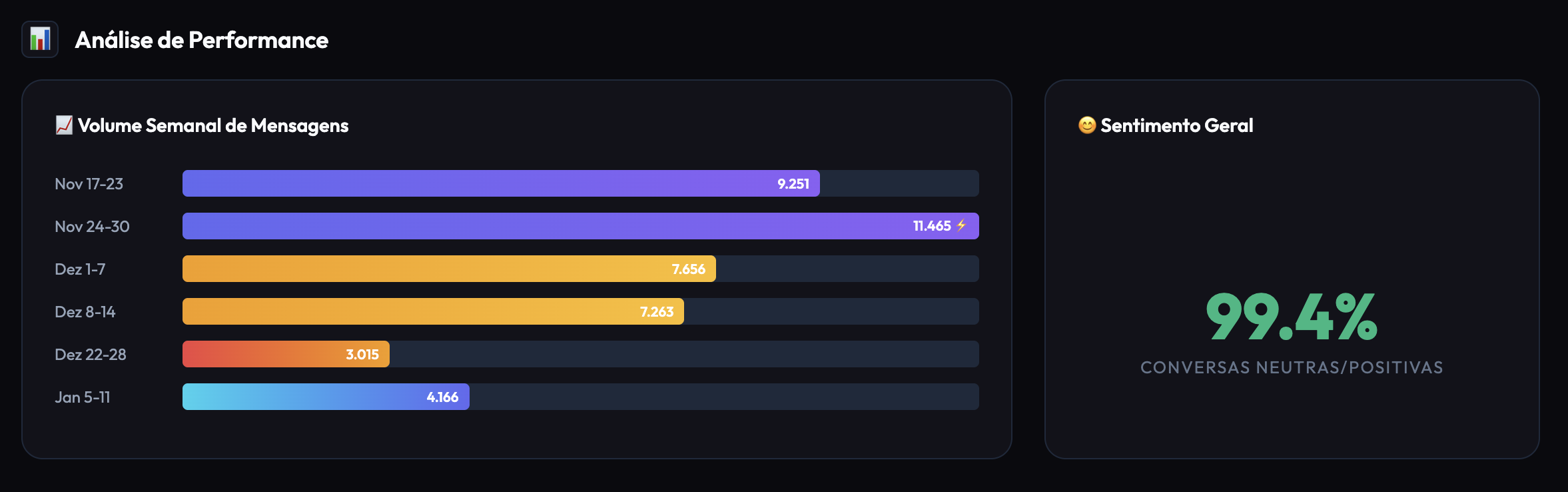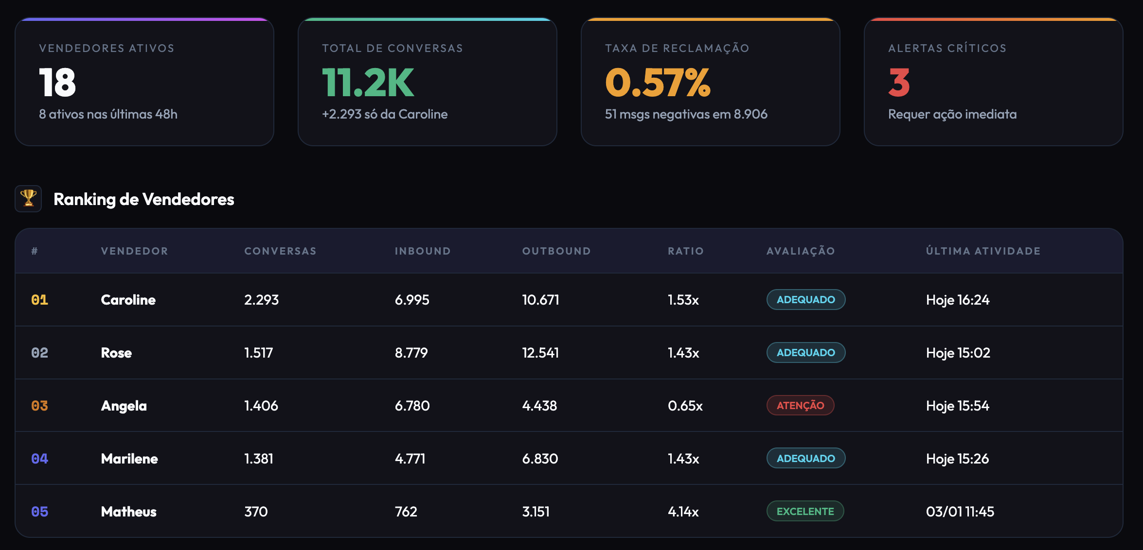 Análise estruturada, com apoio de Inteligência Artificial para identificar padrões, oportunidades e gargalos comerciais.