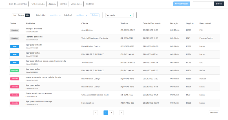 Através de uma agenda conectada a cada atendimento, o vendedor sempre se encontra organizado. Essa funcionalidade também está vinculada ao um sistema de checklist que apresenta ao gestor quais atividades foram realizadas e as que estão atrasadas.