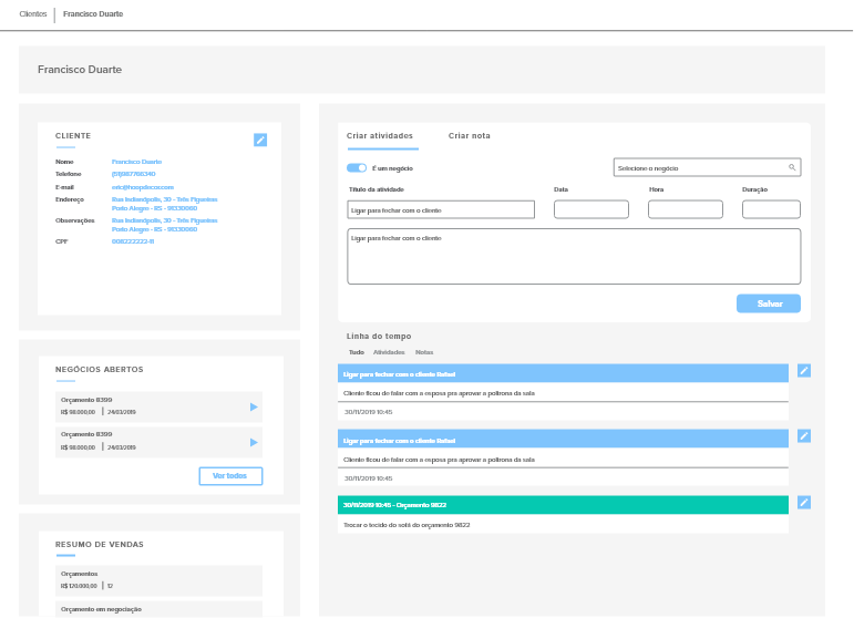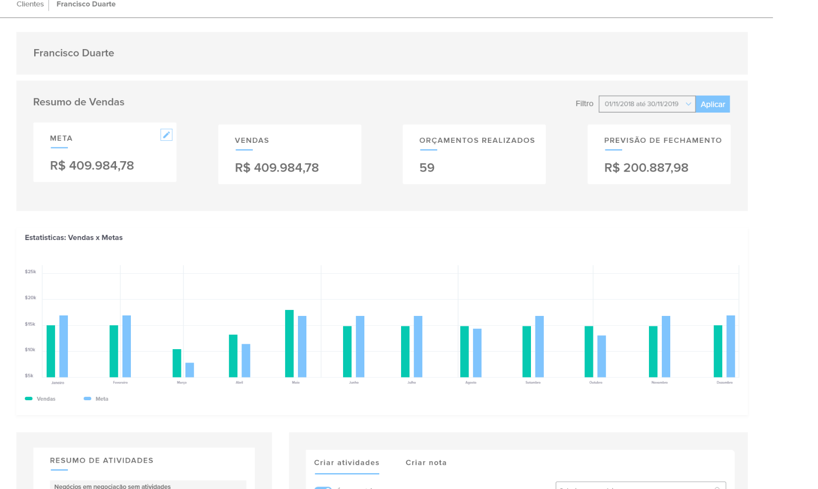 Através de uma página dedicada a cada vendedor, o gestor consegue acompanhar as métricas de orçamentos, previsão de fechamento, vendas, metas mensais, taxa de conversão de vendas, atividades a serem realizadas, atividades atrasadas e o histórico de ações com os clientes. Também é possível acessar de forma rápida toda rede de arquitetos e clientes.